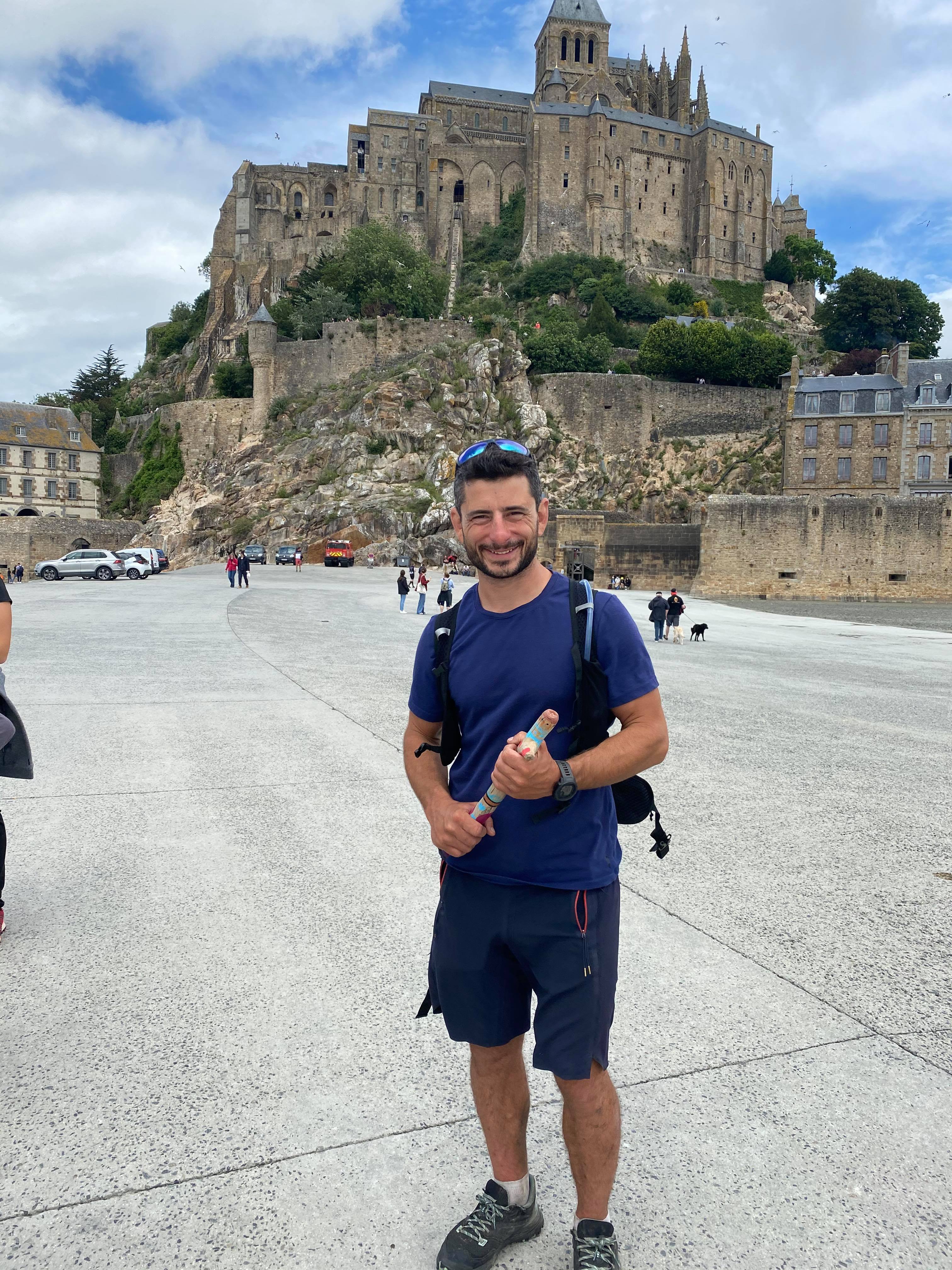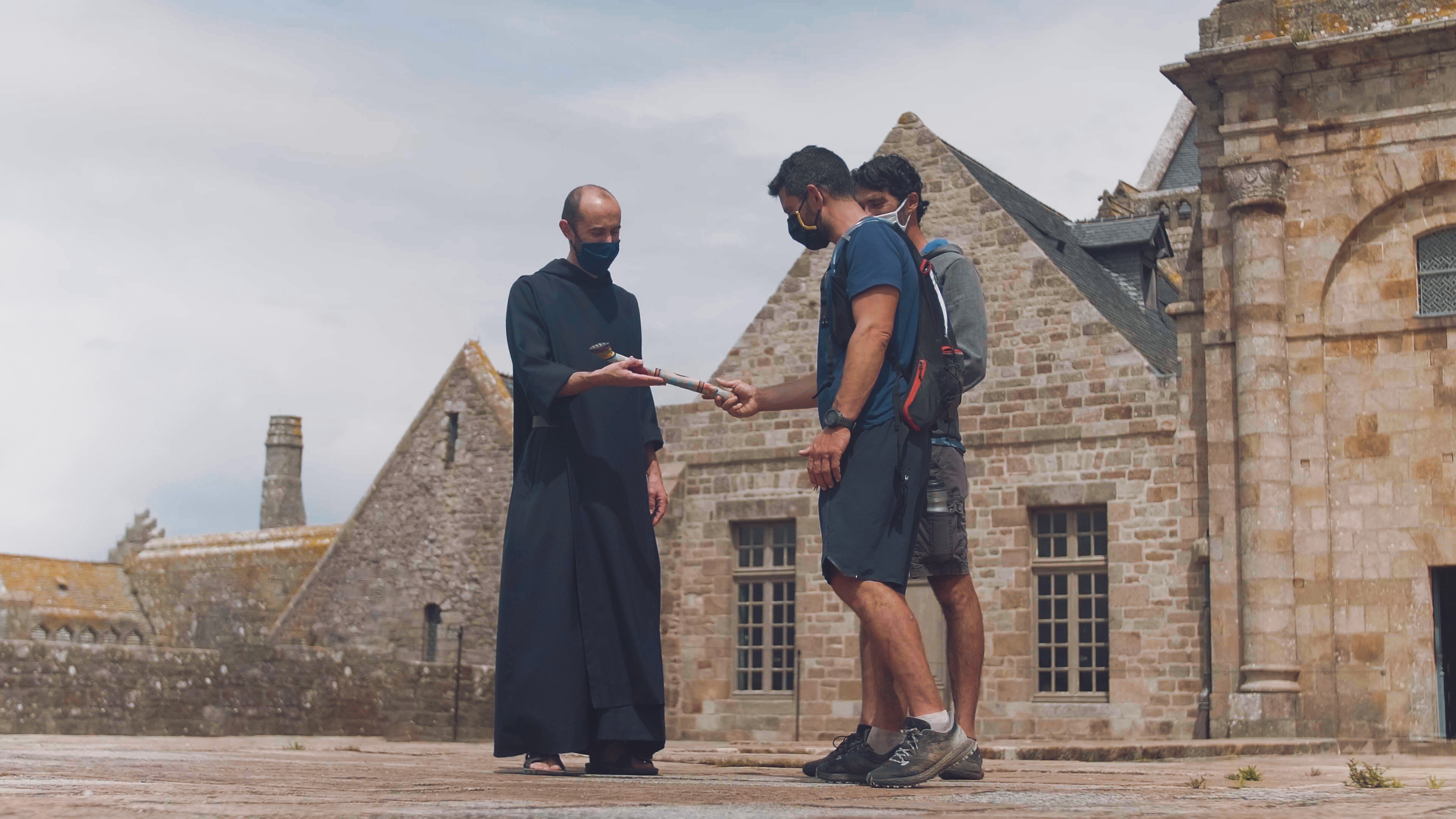 Pour finir cette aventure symbole de lien humain et transmission, nous avons confié les bâtons au Frère Théophane dans l’Abbaye du Mont St Michel.