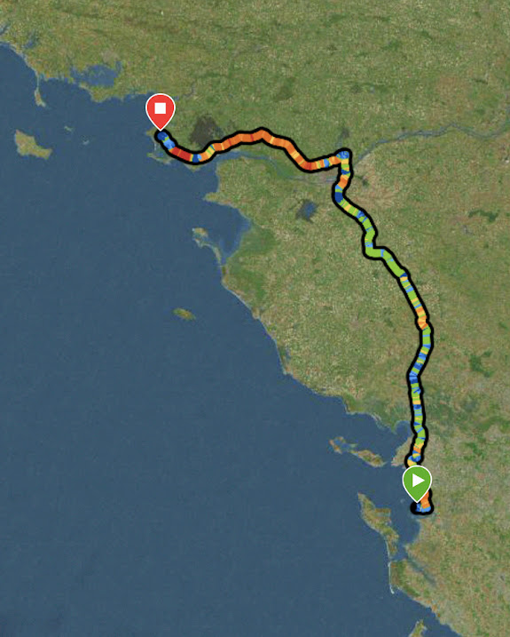 Sans attendre je suis monté dans la voiture de Catherine avec qui j’ai rapidement franchit la barre des 100 km avant qu’elle ne me dépose à Saint-Fulgent.