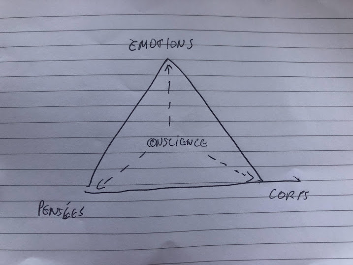 Ces trois pôles sont en interactions. Notre perception du monde est interprétée par nos pensées… Nos pensées génèrent des émotions… Nos émotions nous mettent en mouvement…
