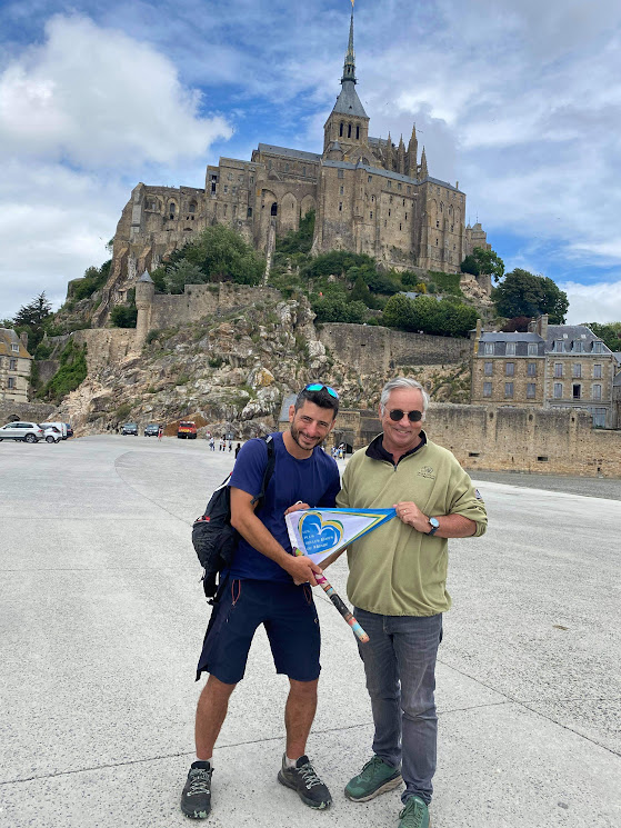 En 2021, à l’arrivée du Bay 2 Bay (ma traversée de la Bretagne en triathlon), nous avons été accueillis par le responsable de frairie pour lui remettre le bâton témoin.