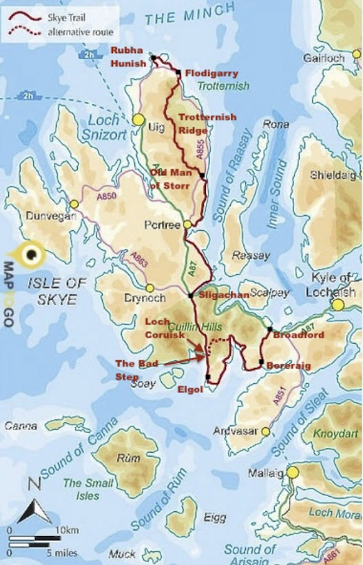 Mon défi personnel sera de traverser l’île de Skye en courant sur le « Skye Trail« , un sentier de randonnée compliqué de 128 km et de 4855 m D+… En moins de 20h !