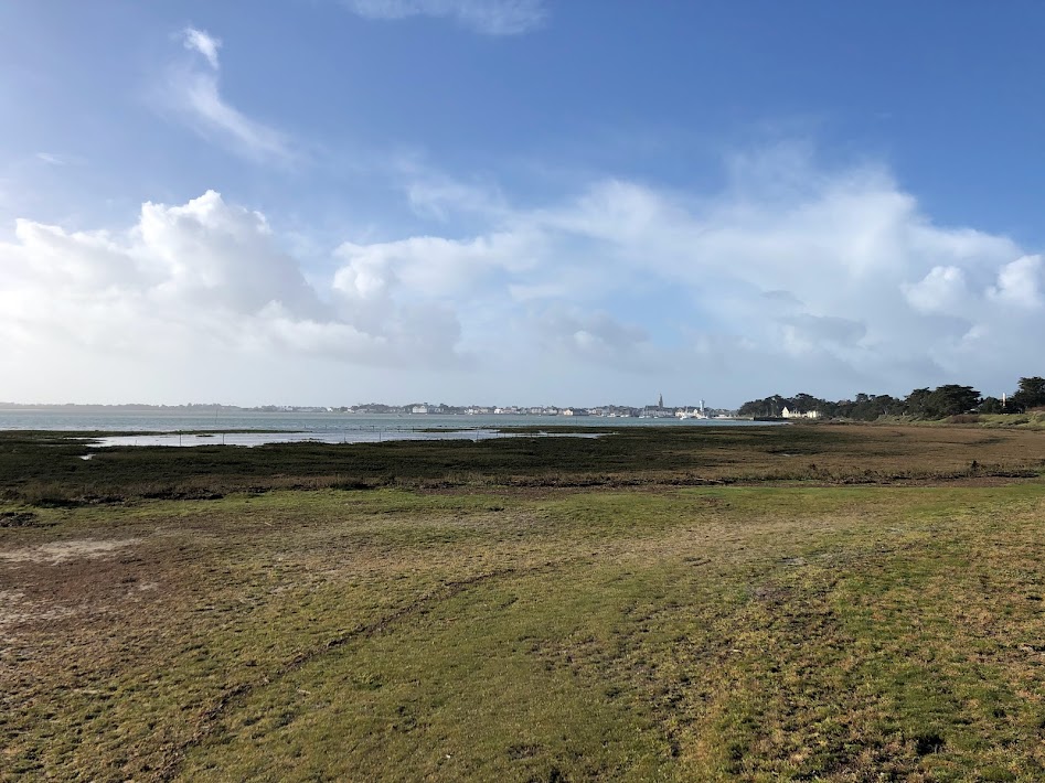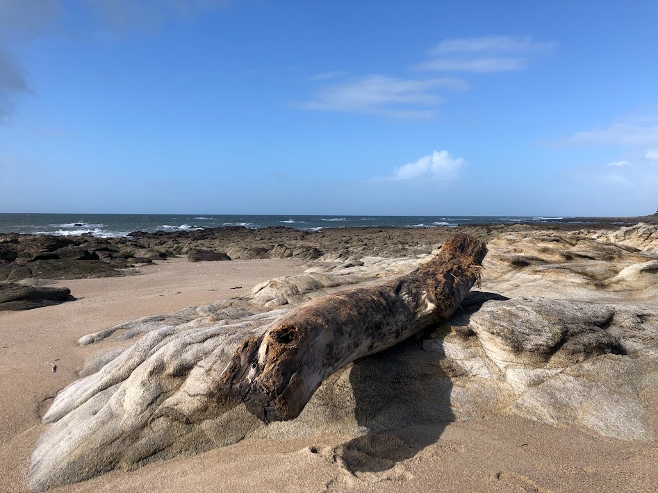Après avoir déposé les enfants à l’école, j’attache le vélo et la remorque, puis je pars en courant en direction de la pointe de Pen Bron. Je longe d’abord les marais salant avant de plonger dans la forêt de pin et d’arriver au niveau de l’isthme. Le vent souffle encore, mais le ciel est dégagé et les températures de printemps sont de retour. Une belle journée s’annonce en perspective. Quelle chance ! Fidèle à ma ligne de conduite du jour, je longe la plage autant que possible. Je sais pour autant que je ne trouverais pas de trésor ici, puisque la pointe est abritée des vents de suroît par la Presqu’île du Croisic.