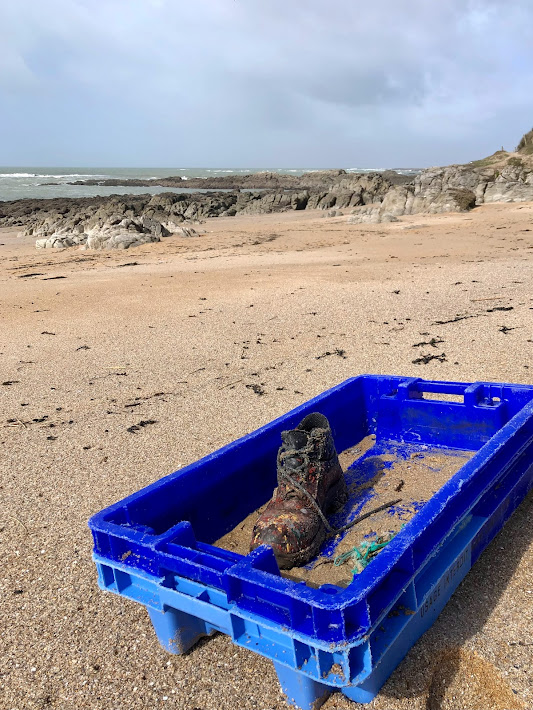 En revenant sur mes pas après 15 km parcouru, je trouve deux belles caisses de criée du port de La Turballe. Il arrive que les caisses tombent en mer depuis les bateaux de pêche. L’avantage de celles qui nous sont offertes par l’océan, est qu’elles ont été lavées par dame nature et qu’elles ne sentent plus le poisson ! Dans l’une des caisses, il y a une chaussure de peintre. J’ai comme une impression de déjà-vu… Il me semble avoir trouvé l’autre il y a quelques années… Soit je me fait un film, soit il existe peut-être une confrérie d’artisans qui jettent leurs chaussures à la mer en guise de rituel. Qui sait ?