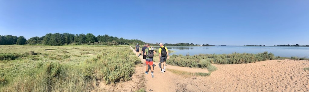 En traversant un lotissement, j’arrive même à sympathiser avec un riverain qui nous offre une saucisse au barbecue. Malheureusement, nous avons 10 minutes d’avances sur la cuisson et nous ne pouvons pas attendre. Nous devons remonter notre vitesse moyenne de déplacement pour espérer passer le deuxième passage à marée basse et arriver dans les temps le lendemain matin.