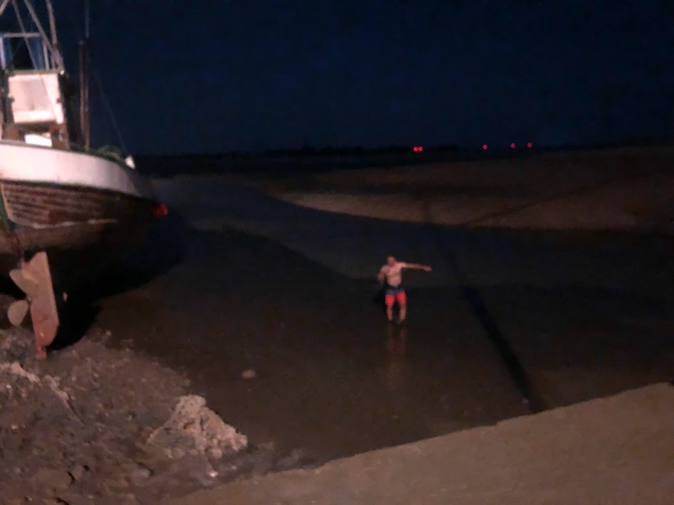 Vers 1h du matin, nous arrivons enfin en face du deuxième chenal. Cette fois la mer est bien basse. Nous nous mettons en maillots de bain, enfilons nos chaussures de vase et mettons nos affaires dans des sacs poubelles. Ensuite nous cherchons un accès à la rive d’en face. A travers les bancs d’huitres de l’étier de Billiers, nous trouvons finalement un passage pour arriver en face.