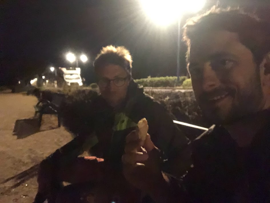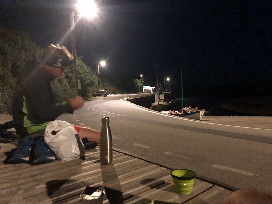 Nous nous accordons alors une pause amplement méritée. Nous restaurons et buvons et un bon café. Si n’avons toujours pas sorti nos lampes frontales, le clair de lune n’est pas le seul à nous éclairer à cet endroit. Tous les lampadaires du port sont restés allumés… pour nous j’imagine !