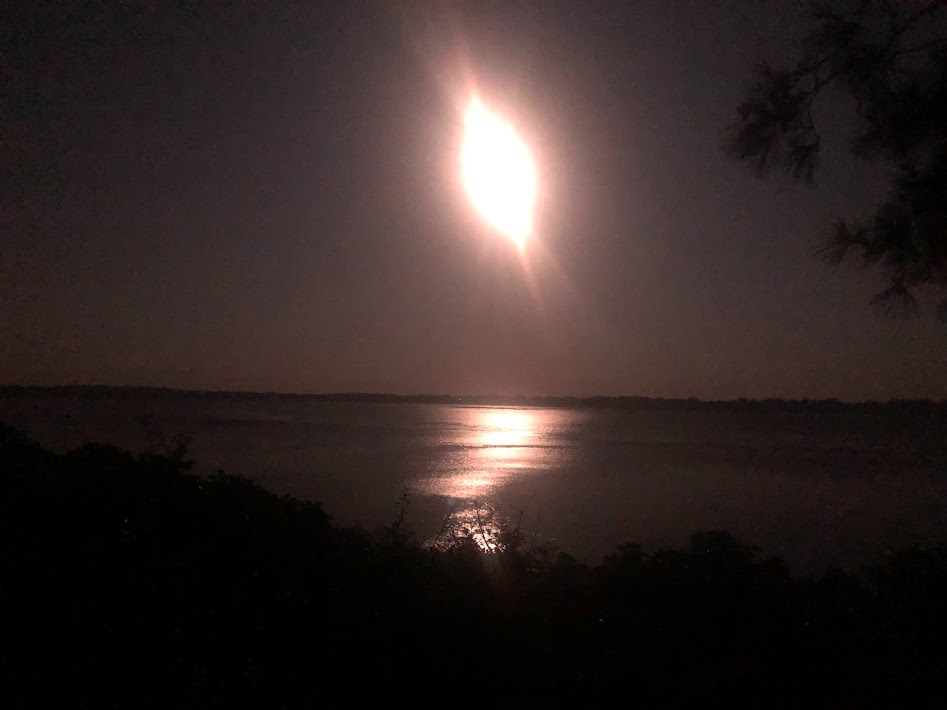 Heureusement nous avons un spectacle pour nous distraire. La lune sous couche maintenant avec sa robe de nuit orangée et le soleil est sur le point de se lever sur un nouveau jour.