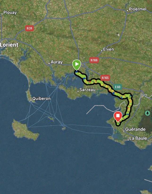 Ensuite, Nico reprend son vélo (laissé dans mon garage) pour rentrer chez lui à Batz sur mer. Quant à moi, je prends le miens pour me rendre du côté de Mesquer. Mon du jour est presque relevé. Je dois maintenant répondre présent au rendez-vous du Dimanche matin… Je détourne mon attention de la douleur et de la fatigue. Quelqu’un compte sur moi pour l’accompagner dans sa victoire du jour !