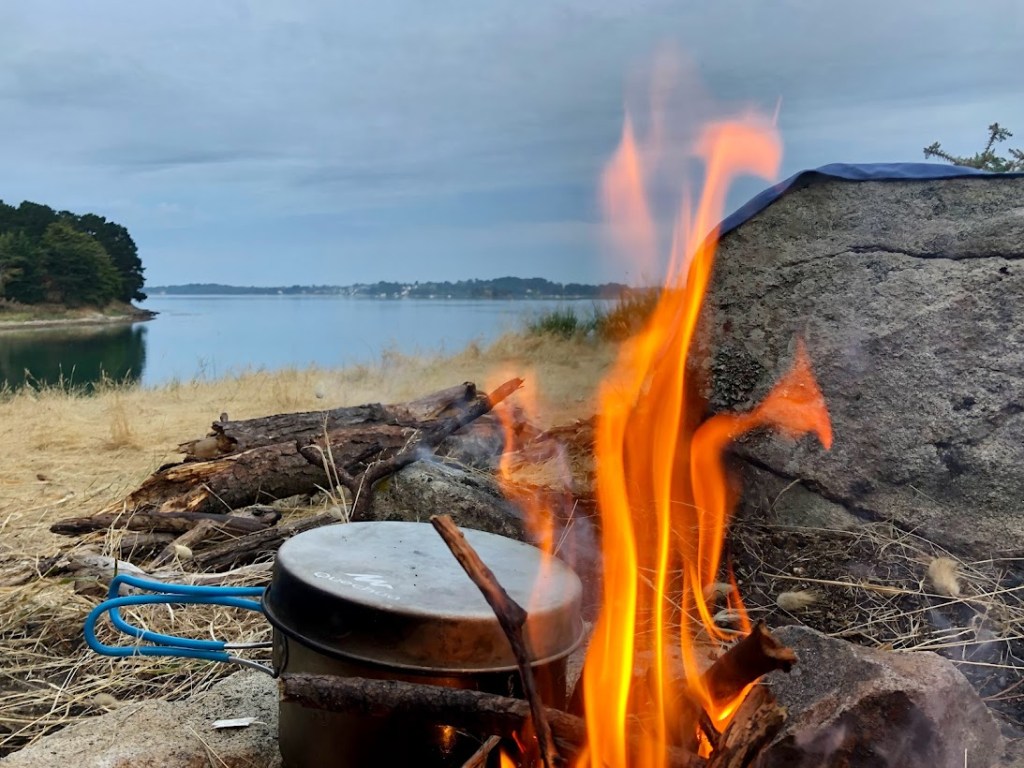 Au menu ce soir c’est pâtes bouillies sur le réchaud. La cartouche de gaz en place dans l’outil arrive en bout d’expiration avant que l’eau ne soit chaude. Je le savais et j’en ai emmené une de rechange. Je lutte un moment sans parvenir à l’insérer. Un primate aurait surement compris plus vite que moi qu’elle n’était pas de la bonne taille. Si je mets parfois du temps à comprendre les choses, je compense la faiblesse par une bonne capacité d’adaptation. Je décide prudemment d’allumer un feu dans le foyer laissé par les campeurs précédents et d’y cuire mon plat à même la flamme. Je n’avais pas prévu de faire de feu, mais je ne regrette pas. Au contraire, je me sens encore plus connecté à la nature et aux éléments.