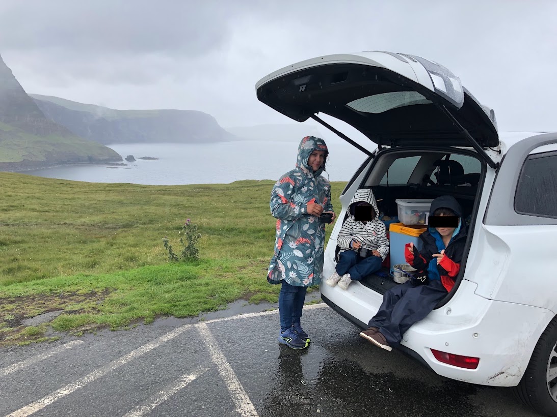 Cela me rappel un épisode en Ecosse où nous avons pique-niqué à l’abris de l’averse derrière la voiture. Tout les visiteurs avaient quitté le site et, dès que la pluie s’est arrêté, nous avons « eu » la pointe de Neist Point juste pour nous !