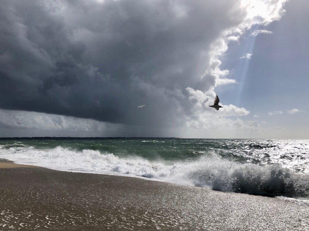 Dans la dernière ligne droite pour franchir la dune qui nous sépare de la plage, on entend le bruit des vagues poussées par la vent et la marée montante.