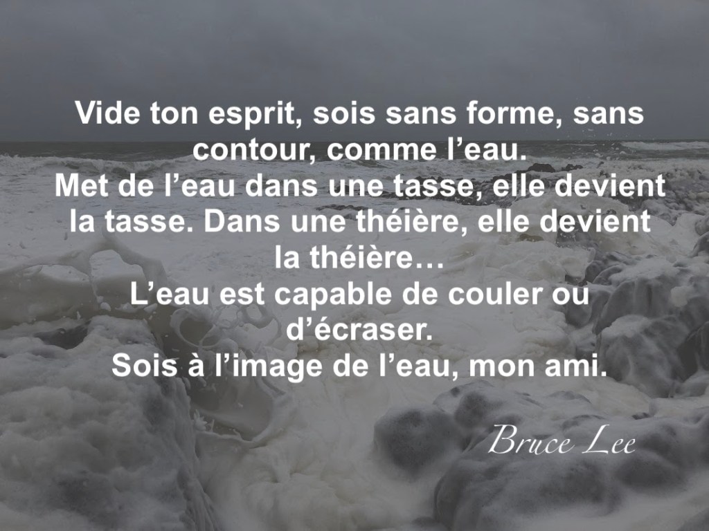 C’est également ce qu’a compris Bruce Lee lorsque, renvoyé par son maître de kung fu pour « méditer ». De rage, il a tenté de frapper l’eau du port de Hong Kong…