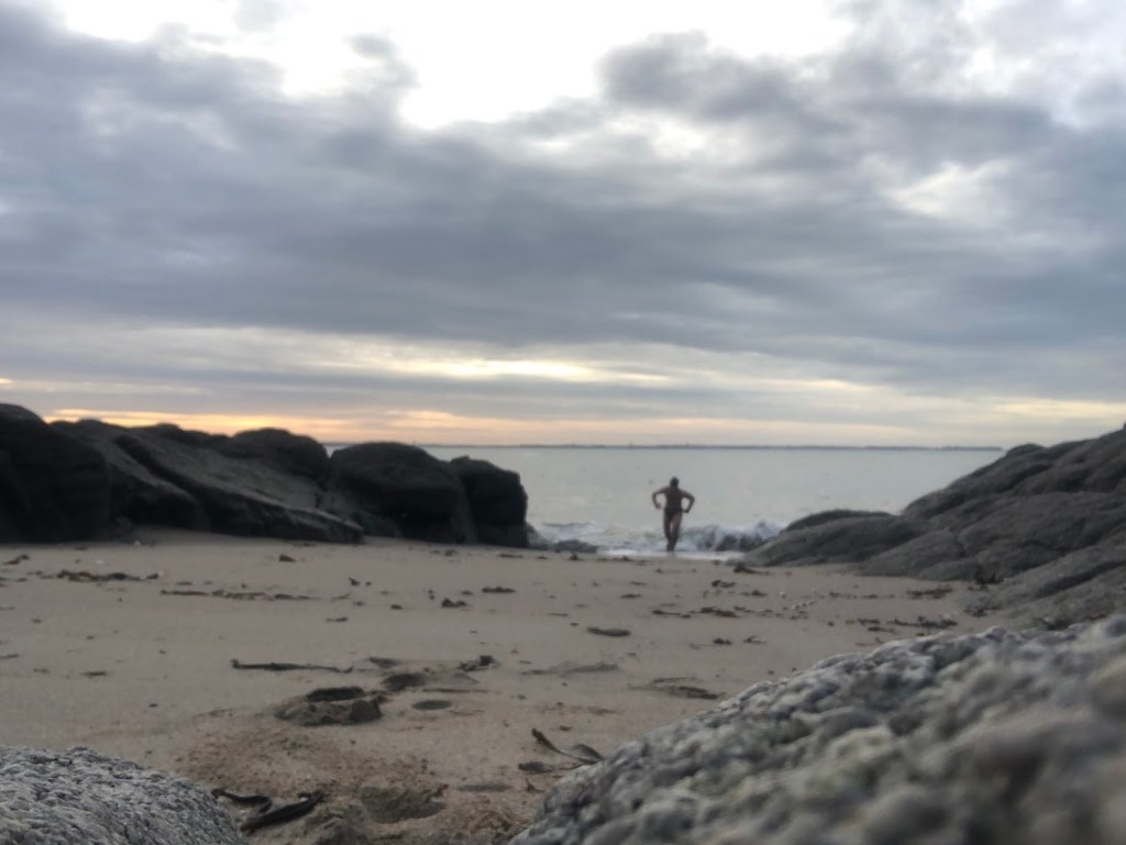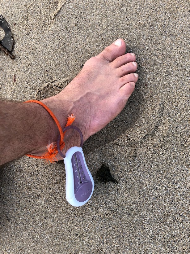 Je dois tester mon nouveau thermomètre de bain acheté sur vinted (sans emballage plastique !). Je l’attache à une cheville avec un bout de filet et de pêche récupéré sur la plage. J’ai envie de progresser en nage en eau froide et un dicton dit que « Si on veut progresser il faut mesurer. » Verdict : 7 minutes de nage dans une eau à 12 degré.