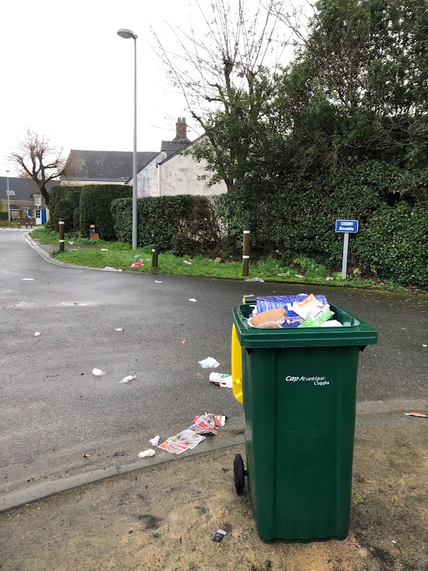 Ce matin, sur la route à vélo, je passe devant poubelle jaune dont une partie du contenu s’est envolé sur la route.