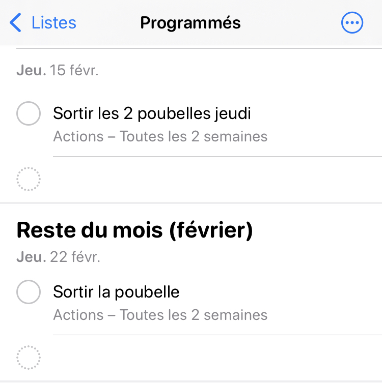 Dans votre checklist de rappel, marquez « sortir la poubelle » quand c’est juste le jour de la poubelle verte. Dans les paramètres du rappel, marquez « répéter tous les 15 jours ».