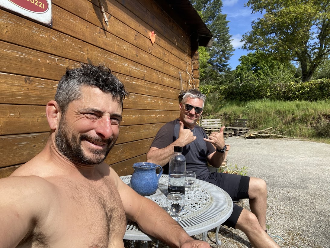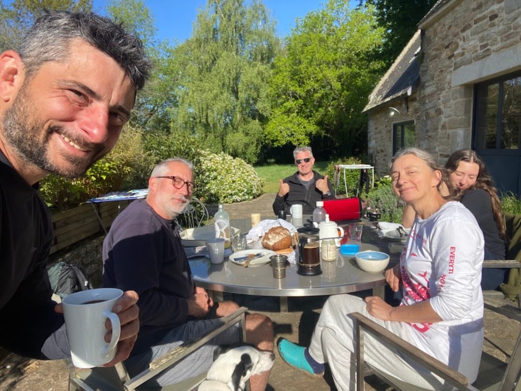 Alors qu’on traverse un magnifique hameaux, j’aperçois au loin une famille prenant le petit déjeuner au soleil en terrasse. On croirait presque qu’il tournent une nouvelle version d’une publicité Ricoré. Je tente plusieurs fois de les interpeller du fond de leur propriété. J’ai très envie de partager le moment avec eux sur leur terrasse. La femme fini par m’entendre et accepte de m’ouvrir…